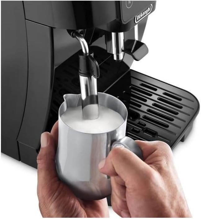 Dankzij het geavanceerde maal- en zetsysteem kun je kiezen uit verschillende koffiesterktes en hoeveelheden. De handmatige stoompijp maakt het mogelijk om melk op te schuimen voor cappuccino’s en lattes. Het compacte en elegante ontwerp in zwarte afwerking past perfect in elke keuken.