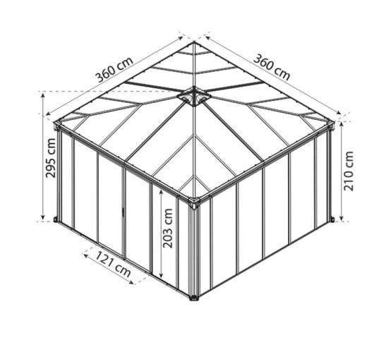 La tonnelle de jardin fermée Ledro de Canopia transforme votre espace extérieur en véritable pièce de vie utilisable toute l’année. Avec ses dimensions généreuses de 360 x 360 cm, sa structure robuste et ses panneaux fermés, elle offre un confort optimal tout en vous protégeant du vent, de la pluie et du soleil.