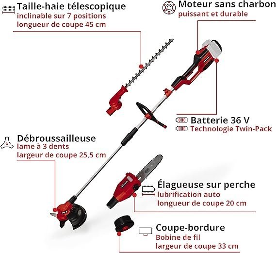 - L’outil multifonctions sans fil GE-LM 36/4in1 Li-Solo Einhell est un appareil performant de la gamme flexible Power X-Change de Einhell. Cet outil combine une tronçonneuse et un taille-haies avec un coupe-bordures et une lame à 3 dents.
