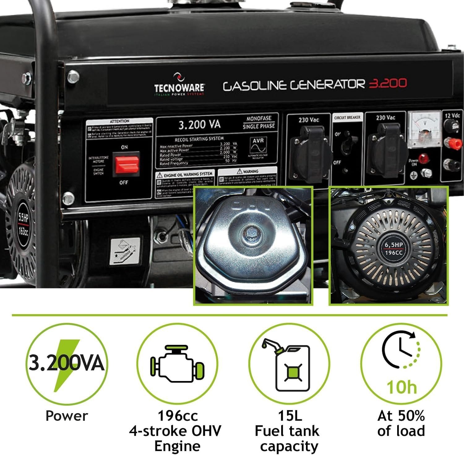 Elektrische generator 3200VA Tecnoware betrouwbare en krachtige stroomvoorziening geschikt voor thuisgebruik, bouwplaatsen en noodstroomvoorziening hoogwaardig motorontwerp met laag brandstofverbruik robuuste constructie voor langdurige prestaties stille werking ideaal voor gebruik in woonwijken en commerciële omgevingen draagbaar ontwerp met wielen en handvatten voor eenvoudige verplaatsing compatibel met diverse elektrische apparaten en gereedschappen eenvoudig te bedienen met duidelijk bedieningspaneel voorzien van veiligheidsvoorzieningen zoals overstroombeveiliging en automatische uitschakeling bij laag oliepeil onderhoudsvriendelijk met gemakkelijk toegankelijke filters en onderdelen geschikt voor continu gebruik en piekbelasting energie-efficiënt ontwerp vermindert operationele kosten en brandstofverbruik Tecnoware kwaliteit en duurzaamheid gegarandeerd betrouwbare stroomvoorziening bij stroomuitval of afgelegen locaties ideaal voor evenementen, tijdelijke installaties en bouwprojecten eenvoudig te installeren en snel operationeel met minimale voorbereiding.