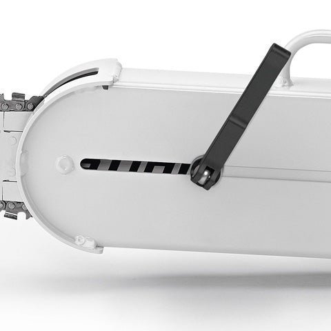 Die Spannschraube wird seitlich durch den Kettenraddeckel hindurch betätigt. Das verhindert den Kontakt der Hand mit der scharfen Sägekette und den Spitzen des Krallenanschlages. (Abb. ähnlich)