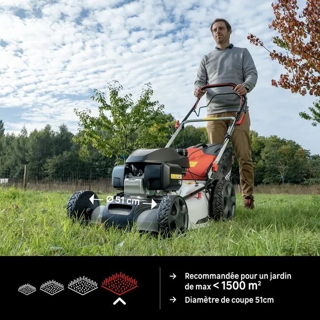 La tondeuse thermique 51 cm STERWINS, moteur HONDA, est idéale pour l’entretien des jardins allant jusqu’à 1500 m². Sa largeur de coupe de 51 cm et l’ajustement centralisé de la hauteur de coupe en 7 positions (de 2.5 cm à 7.5 cm) vous permettent une tonte performante qui s’adapte à tous les gazons. La tondeuse est équipée de la fonction traction pour vous assurer un travail sans effort même dans les pentes. Grand confort de prise en main avec le guidon ergonomique, ajustable en hauteur et recouvert d’une mousse protectrice. Fonction 3en1 pour tondre, mulcher et éjecter. Très grande contenance du bac de ramassage (60 L). Elle se range facilement et est peu encombrante, grâce à son guidon repliable et son bac semi-rigide. Sterwins des produits de qualité : Garantie 5 ans, durée de vie testée et de nombreuses pièces détachées disponibles.
