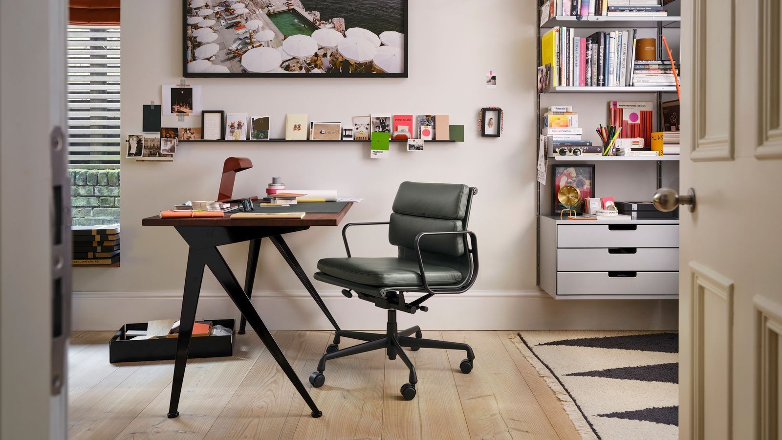 Le bureau Compas Direction Desk de Vitra, conçu par Jean Prouvé en 1953, incarne le mariage parfait entre design intemporel et fonctionnalité. Son nom “Compas” provient de la forme caractéristique de ses pieds, inspirée d’un compas d’ingénierie, conférant à la fois stabilité et légèreté visuelle.